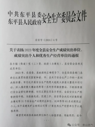 4月份,縣委縣政府召開全縣安全生產(chǎn)治本攻堅(jiān)三年行動(dòng)推進(jìn)暨重點(diǎn)工作安排部署會(huì)議,泰山燃?xì)饧瘓F(tuán)所屬東平泰燃作為“安全生產(chǎn)優(yōu)秀生產(chǎn)經(jīng)營單位”受通報(bào)表揚(yáng)。