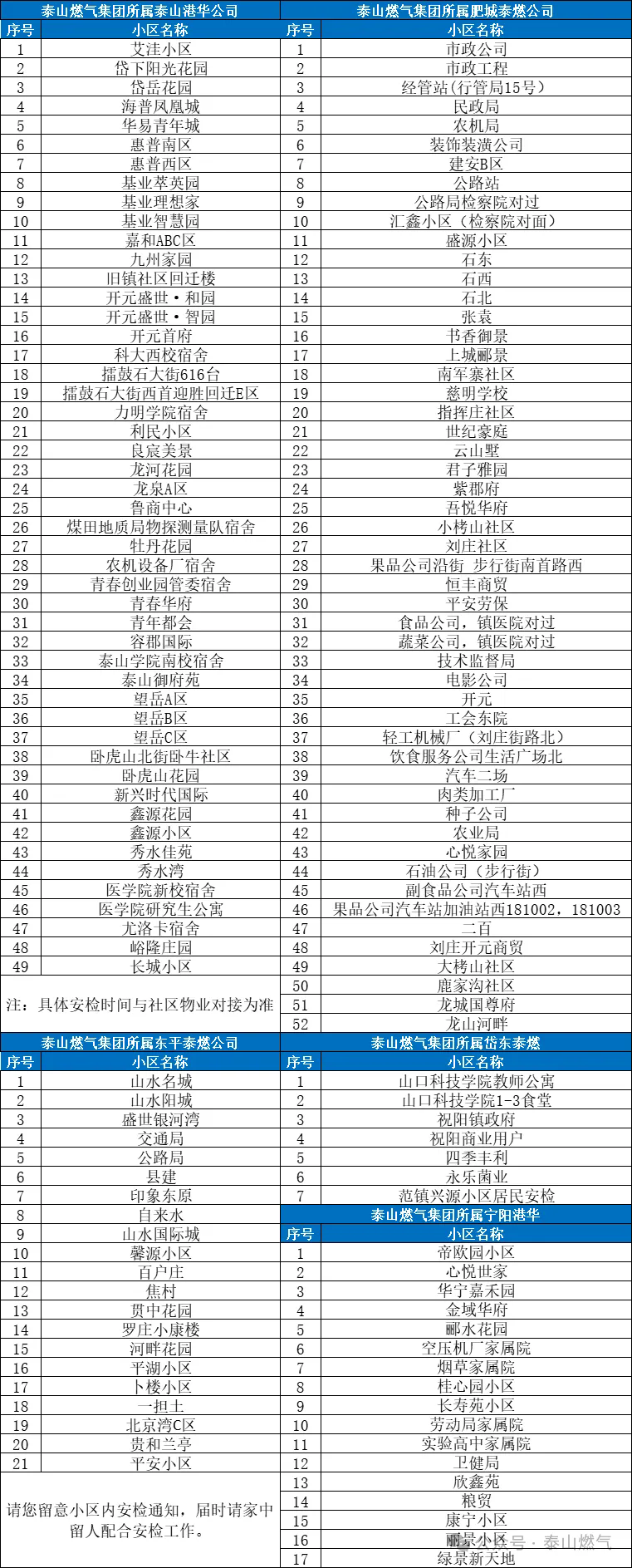 為了您的用氣安全,泰山燃氣集團各主業(yè)單位將于2025年6月在以下各小區(qū)安排戶內燃氣設施安全檢查,請您留意小區(qū)內安檢通知,屆時請家中留人配合我們的安檢工作。